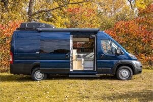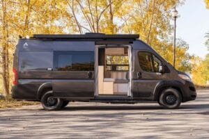 Explore unlimited journeys with an optimized space including a queen-size bed and a full-height fridge. AWD model available. Bright interior featuring windows on both sides of the cabin.