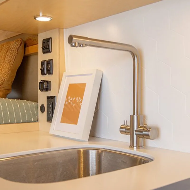 Profitez d’une salle de bain privée qui peut se transformer en un vaste espace de rangement. La cuisine est aménagée d’un seul côté de la van, offrant ainsi plus d’espace pour une circulation fluide.