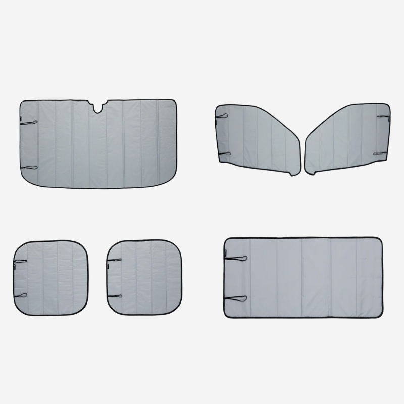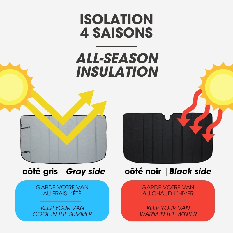 Cet ensemble de panneaux isolants procure une intimité complète dans la cabine avant. Il vous protège des inconforts du climat, vous remarquerez immédiatement que la température est beaucoup plus stable à l’intérieur du véhicule. Indispensable pour éviter le vieillissement accéléré de l’intérieur de votre véhicule dû aux rayons du soleil.