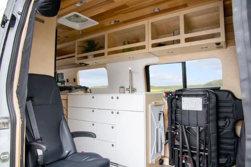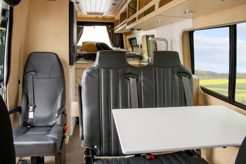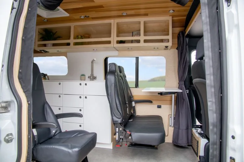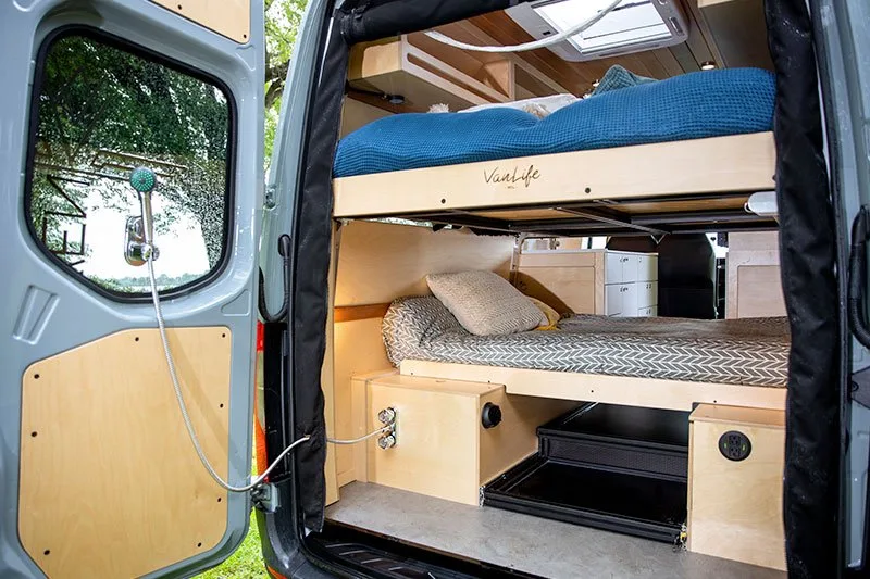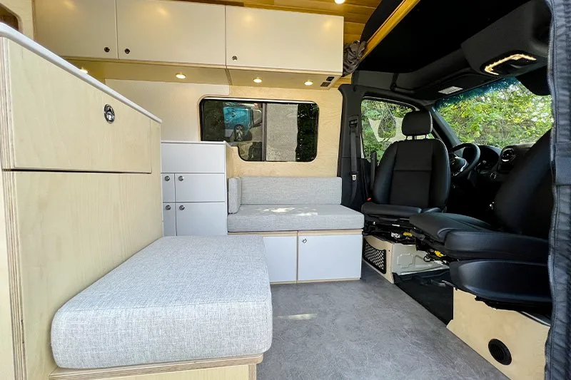 Discover the electric bed, an innovation from VanLife Campers that allows you to maximize your van’s space in one simple move. Lift it to create a lounge/dining area or lower it close to the floor for easy bed access. Available in multiple configurations!